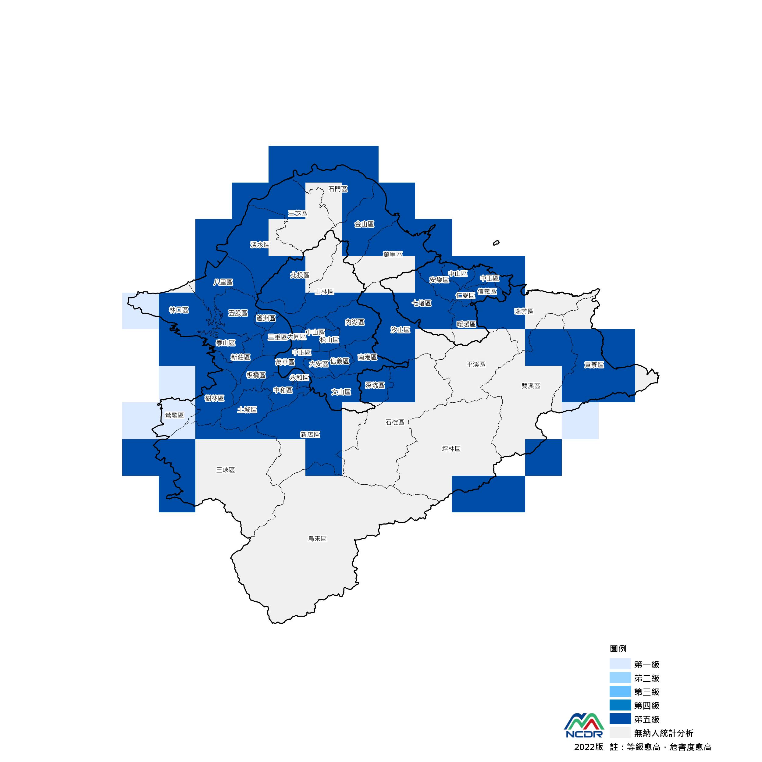 北北基-網格5km淹水災害風險圖,是依據縣市內有淹水潛勢範圍之鄉鎮,相互比較其風險等級。