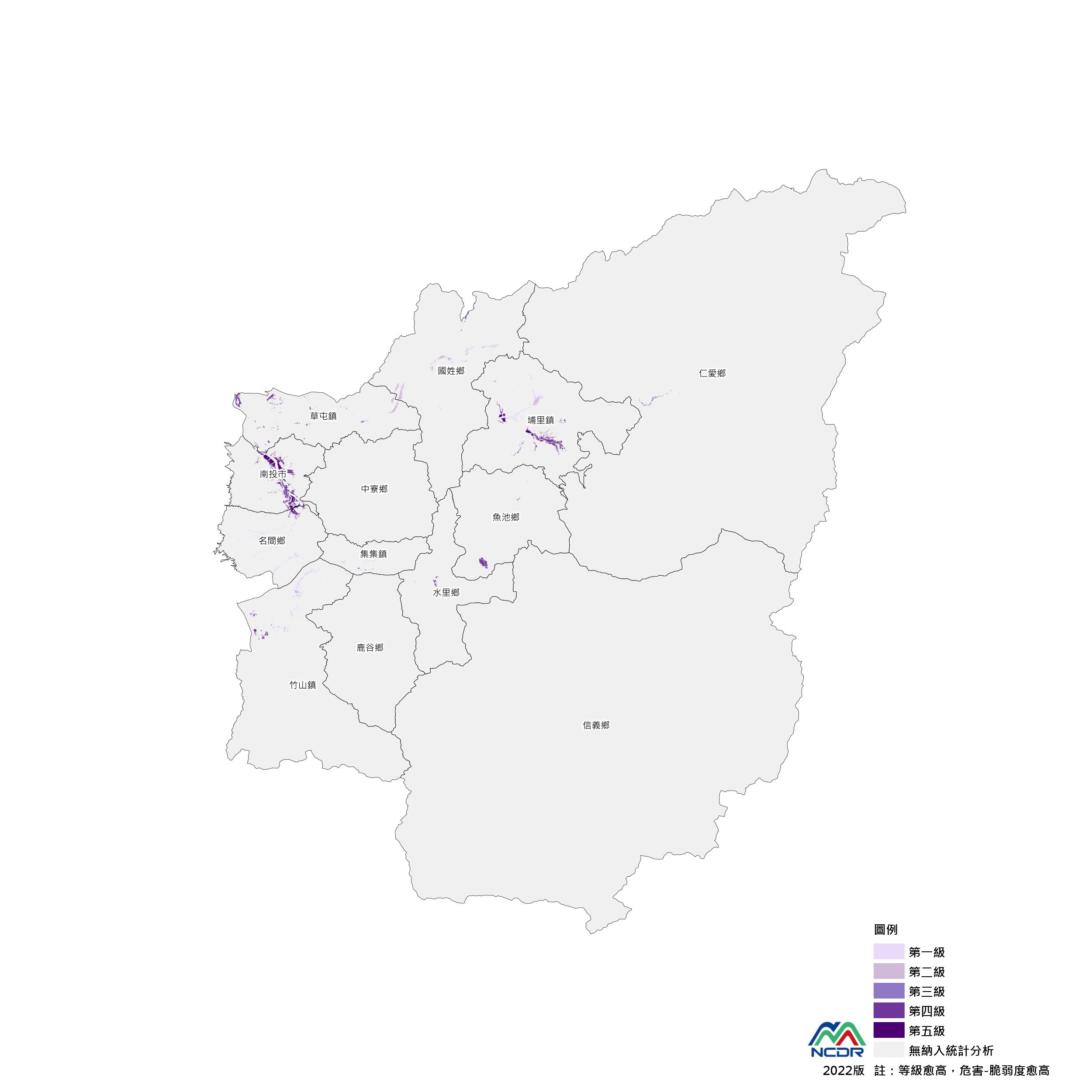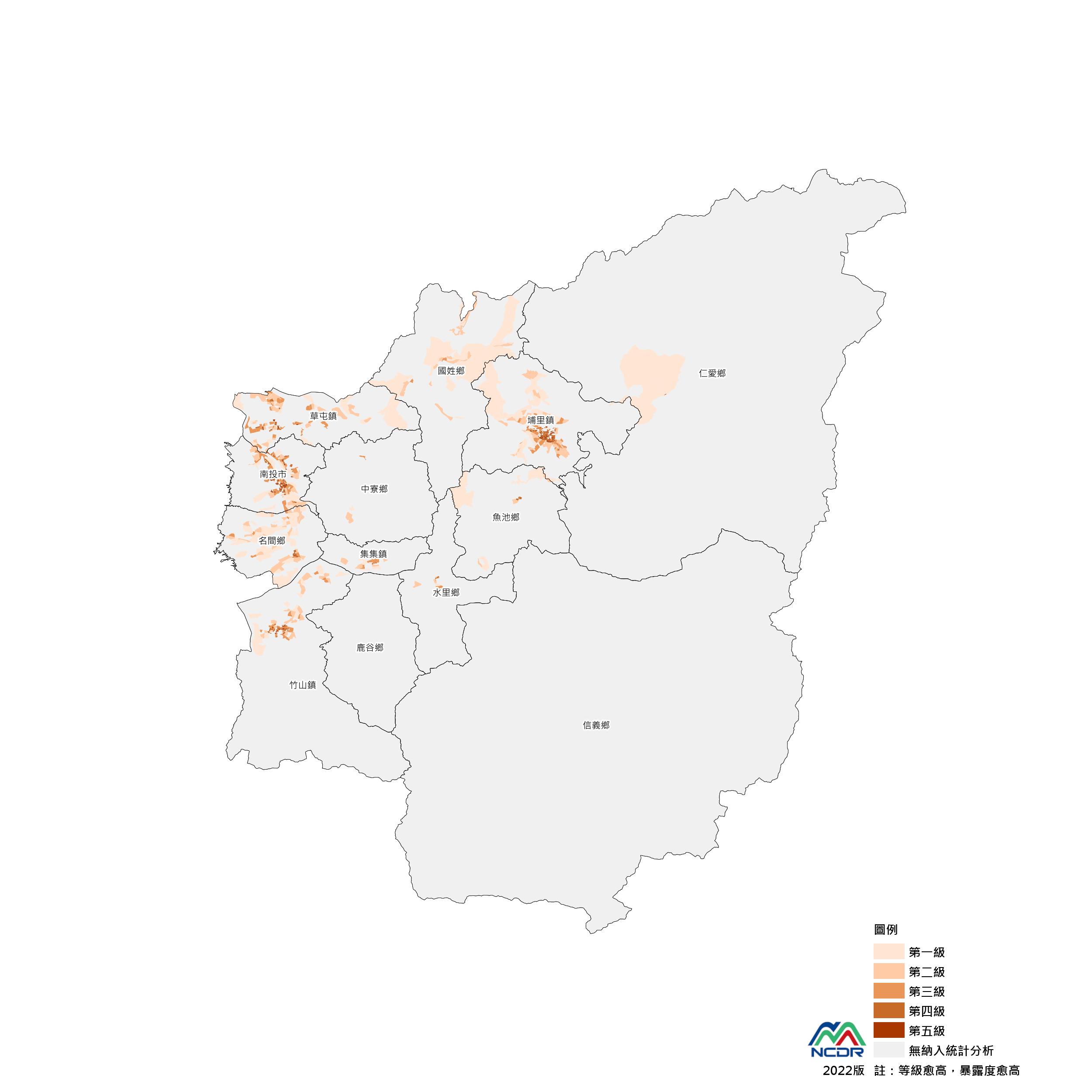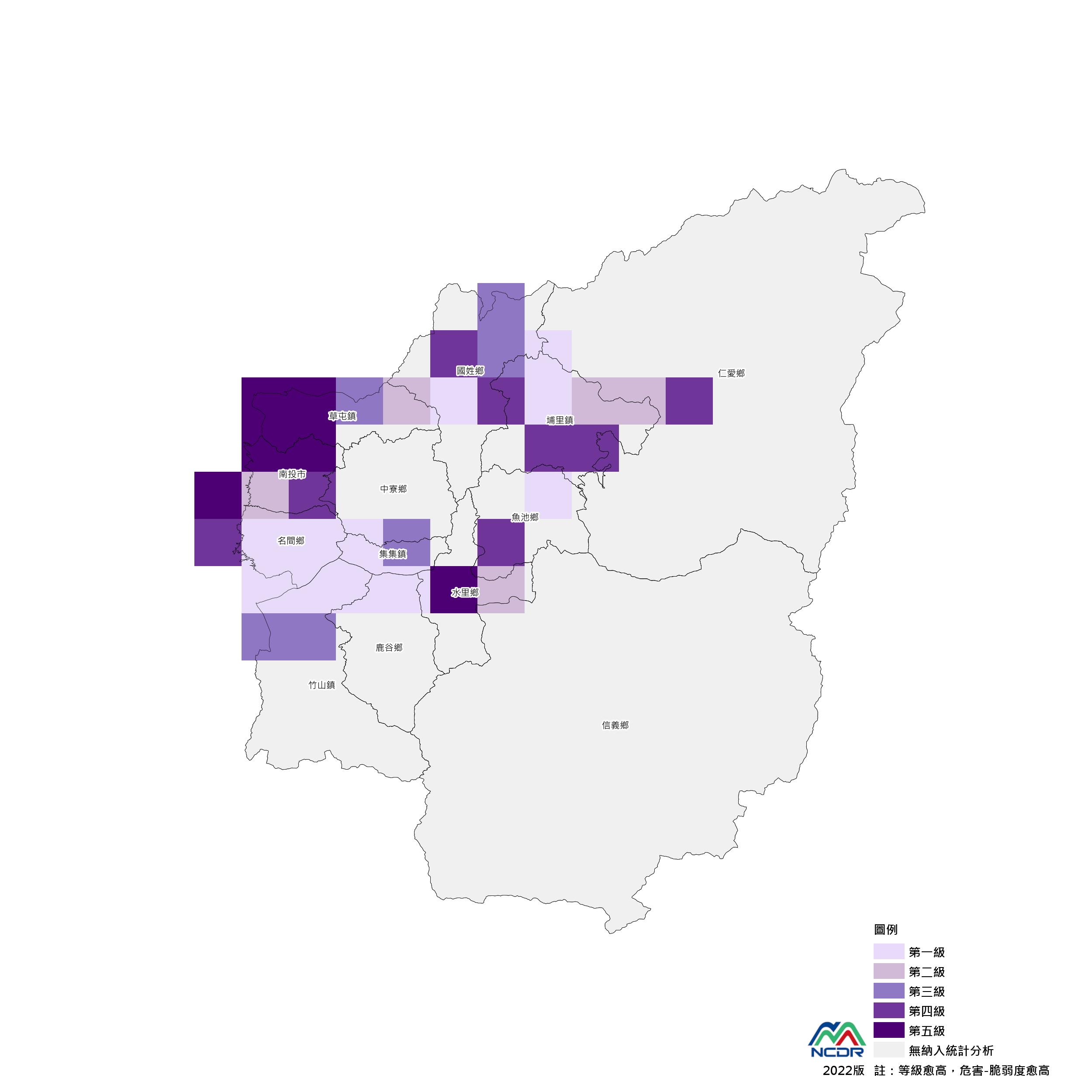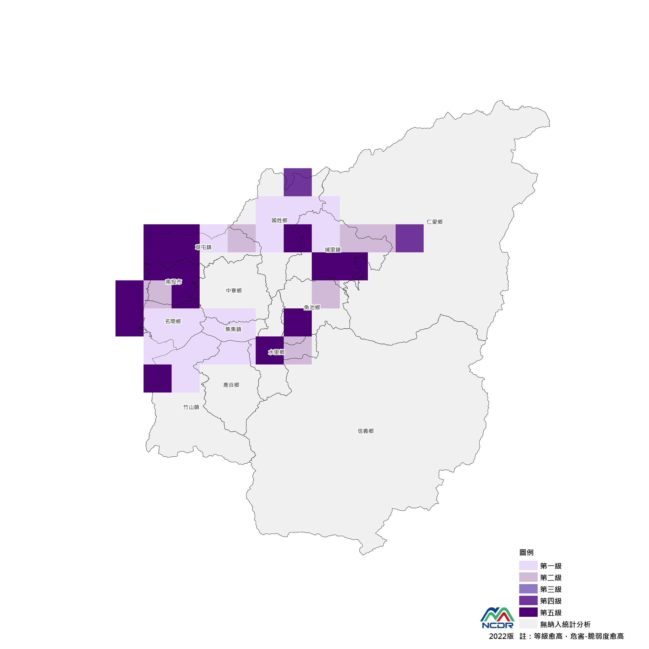 圖資呈現是以全臺有分析淹水潛勢圖之鄉鎮市區,進行相互等級比較,淹水脆弱度等級五,表示該南投縣-鄉鎮市區-鄉鎮市區發生的淹水深度或面積相對較大,淹水脆弱度等級一,表示該鄉鎮市區發生的淹水深度或面積相對較小。