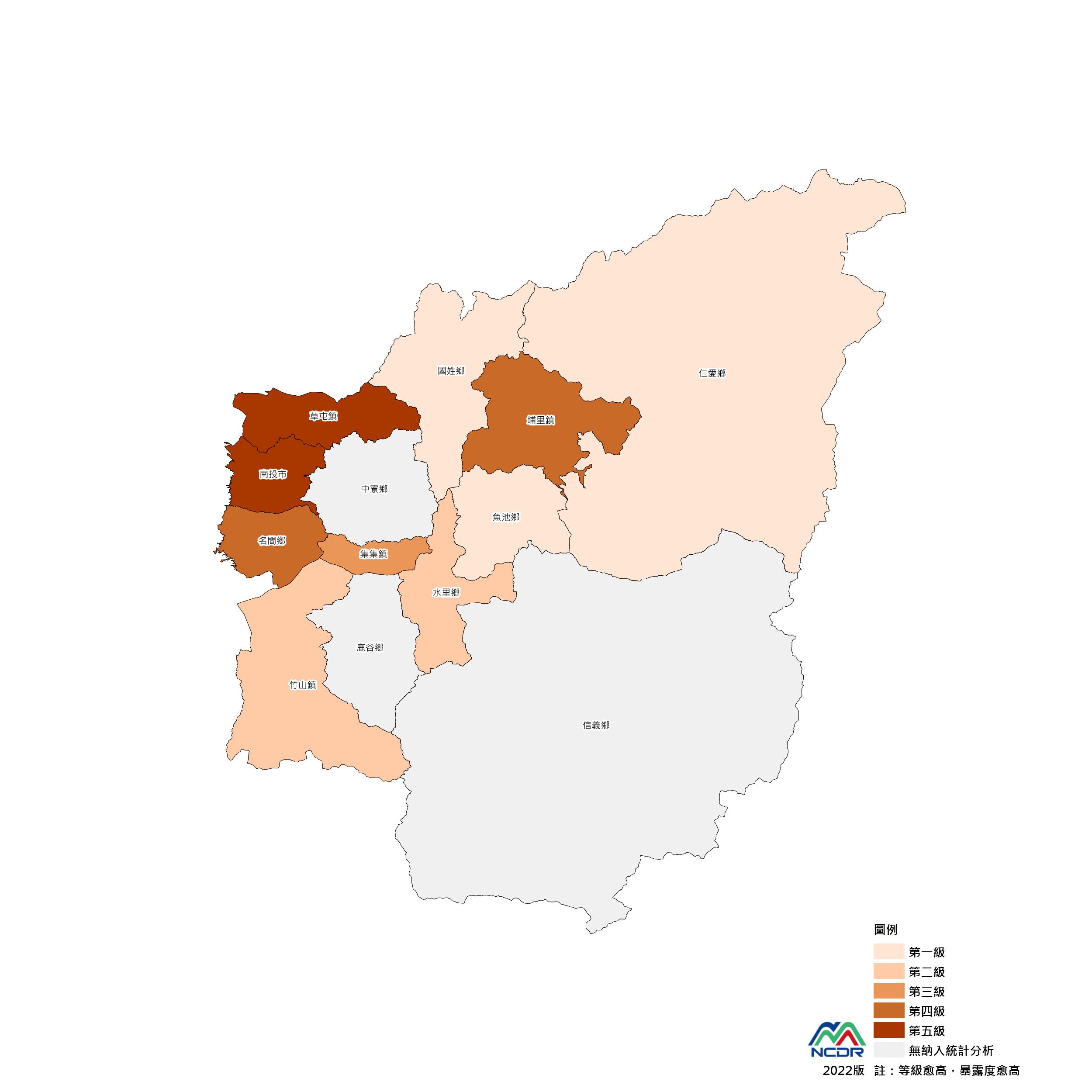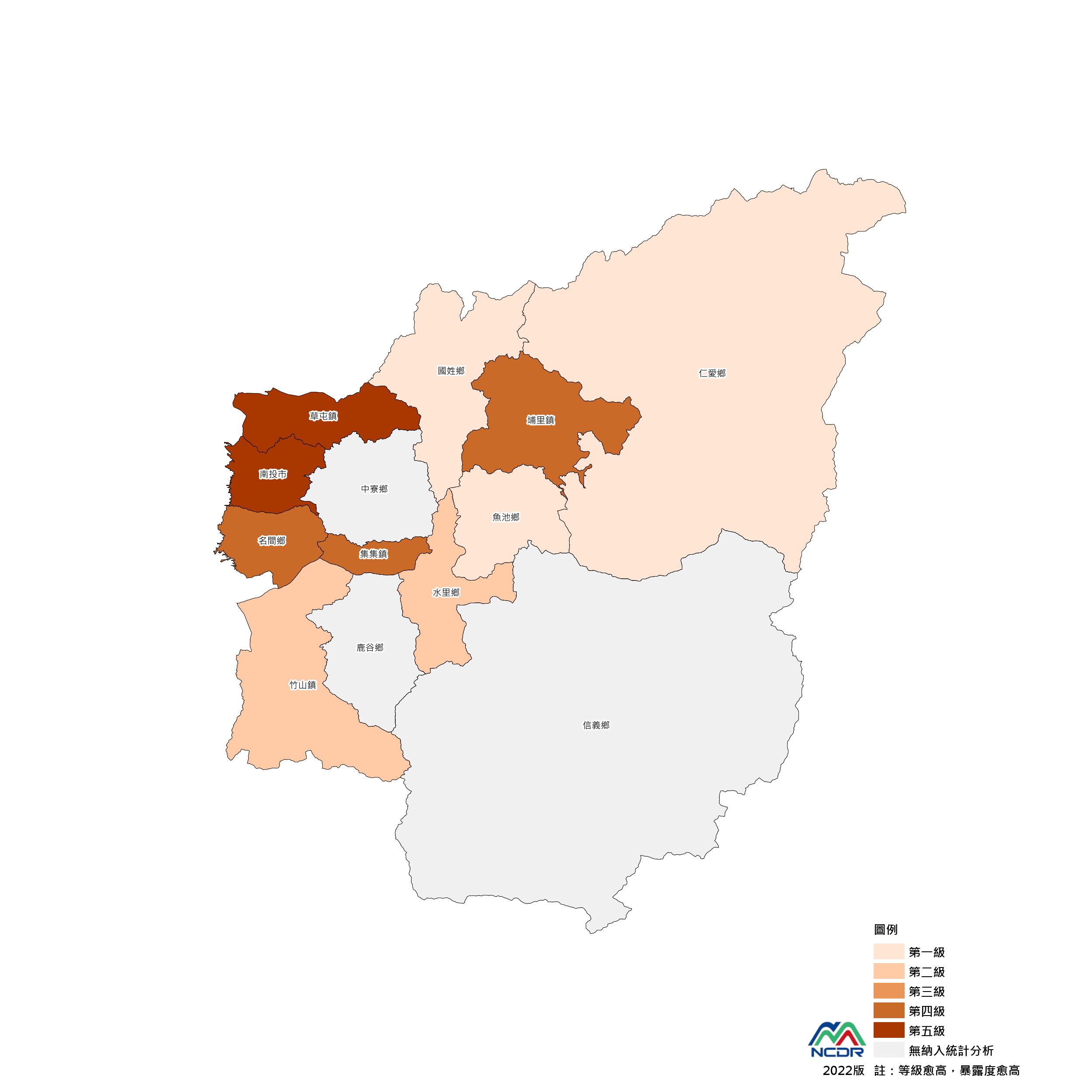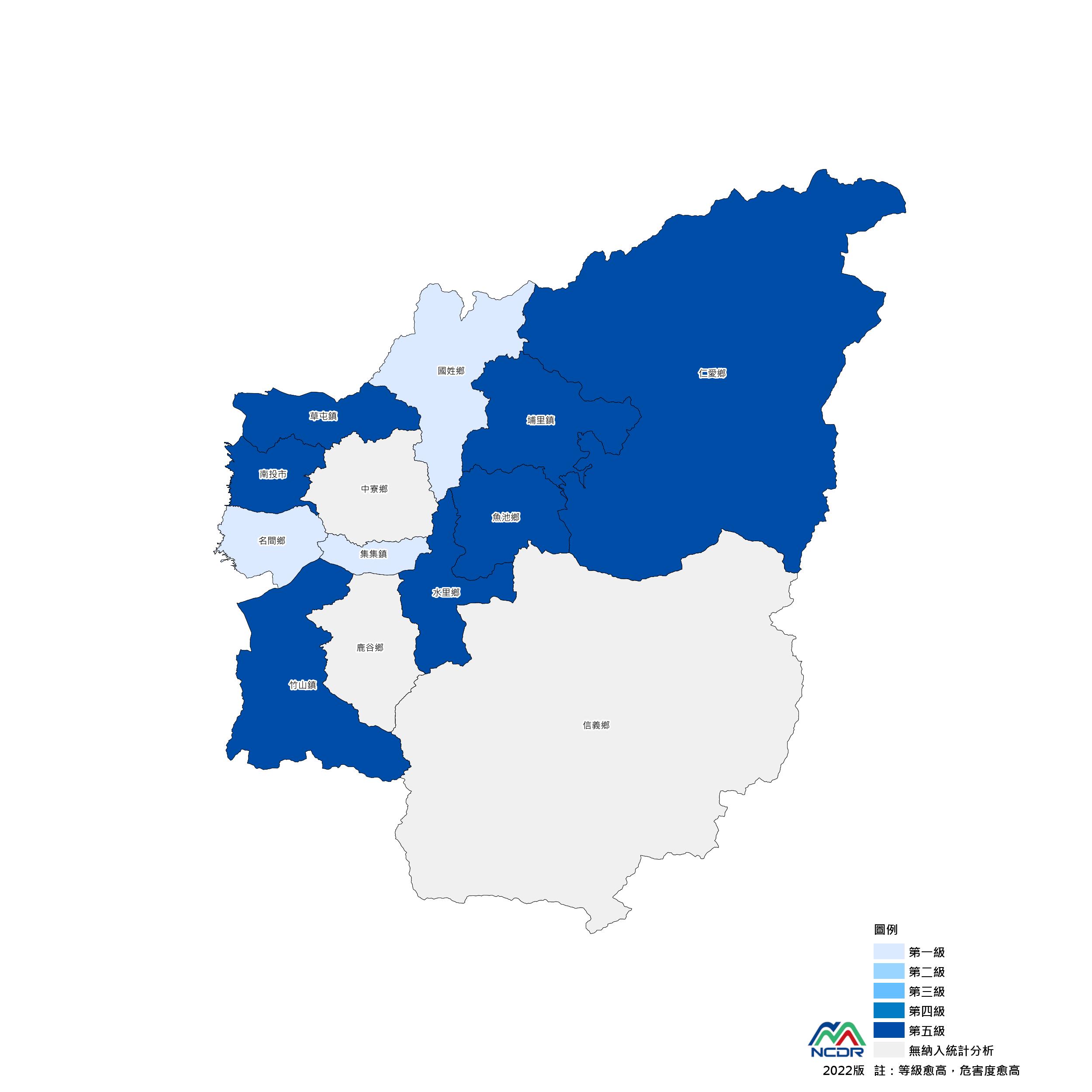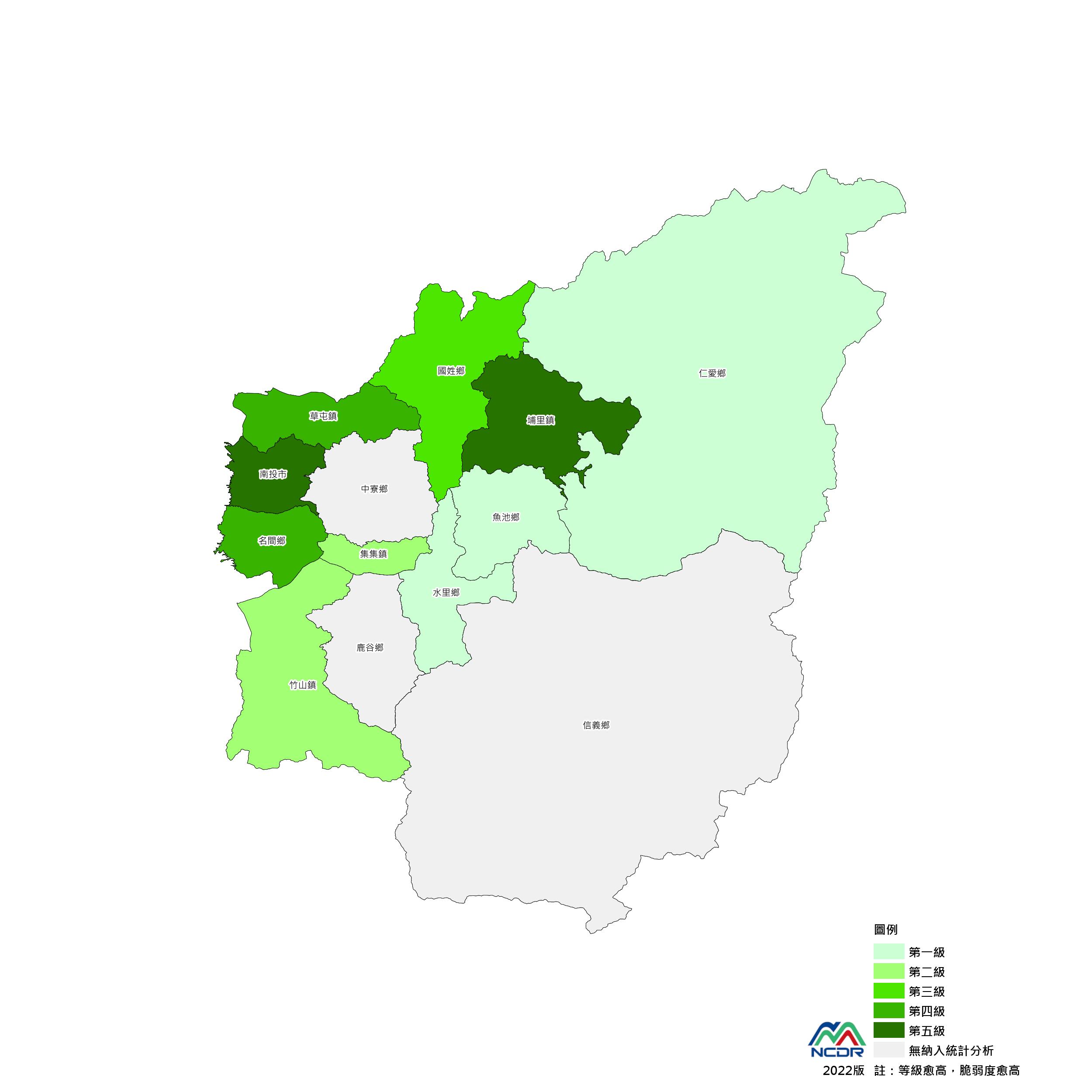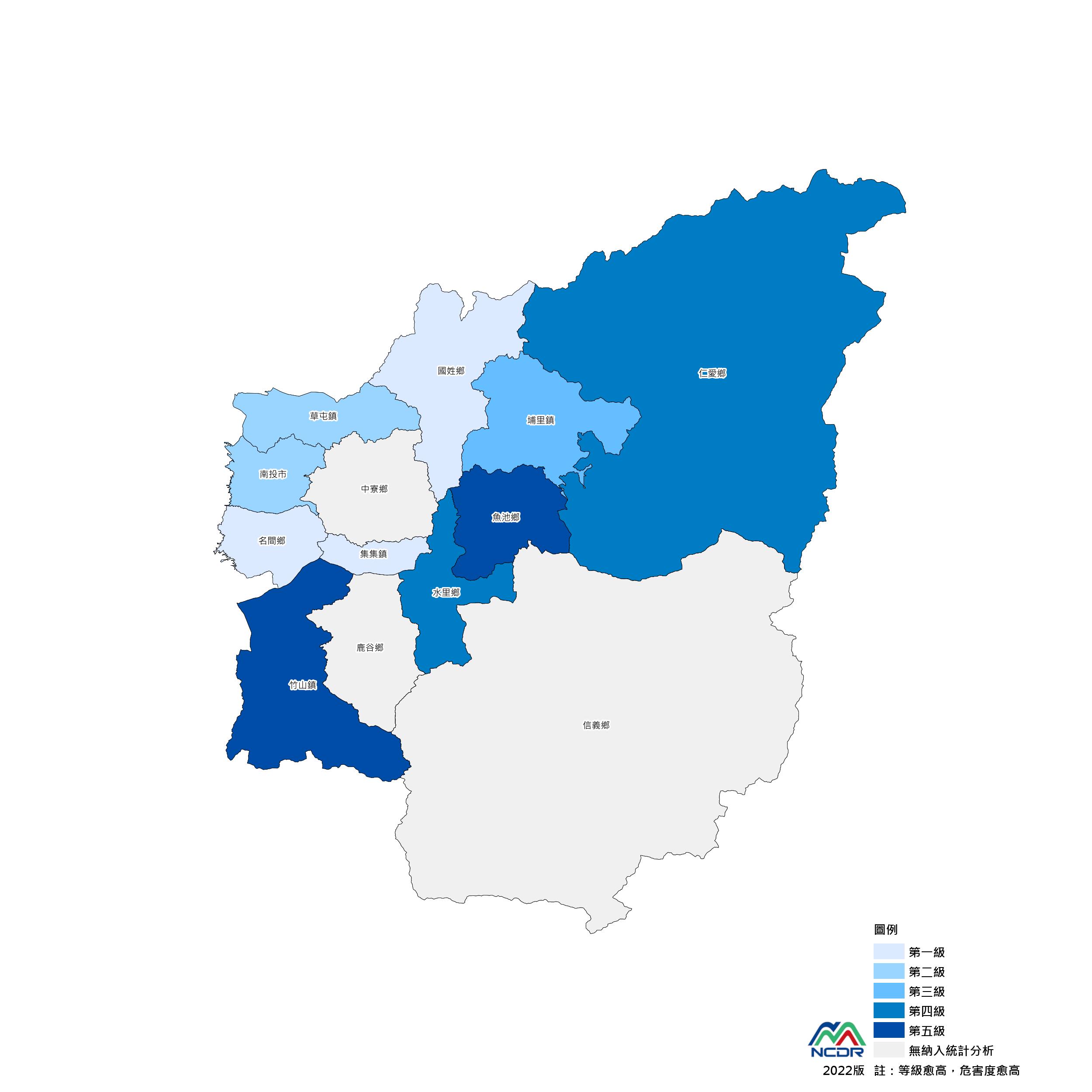 圖資呈現是以全臺有分析淹水潛勢圖之鄉鎮市區,進行相互等級比較,淹水脆弱度等級五,表示該南投縣-鄉鎮市區-鄉鎮市區發生的淹水深度或面積相對較大,淹水脆弱度等級一,表示該鄉鎮市區發生的淹水深度或面積相對較小。