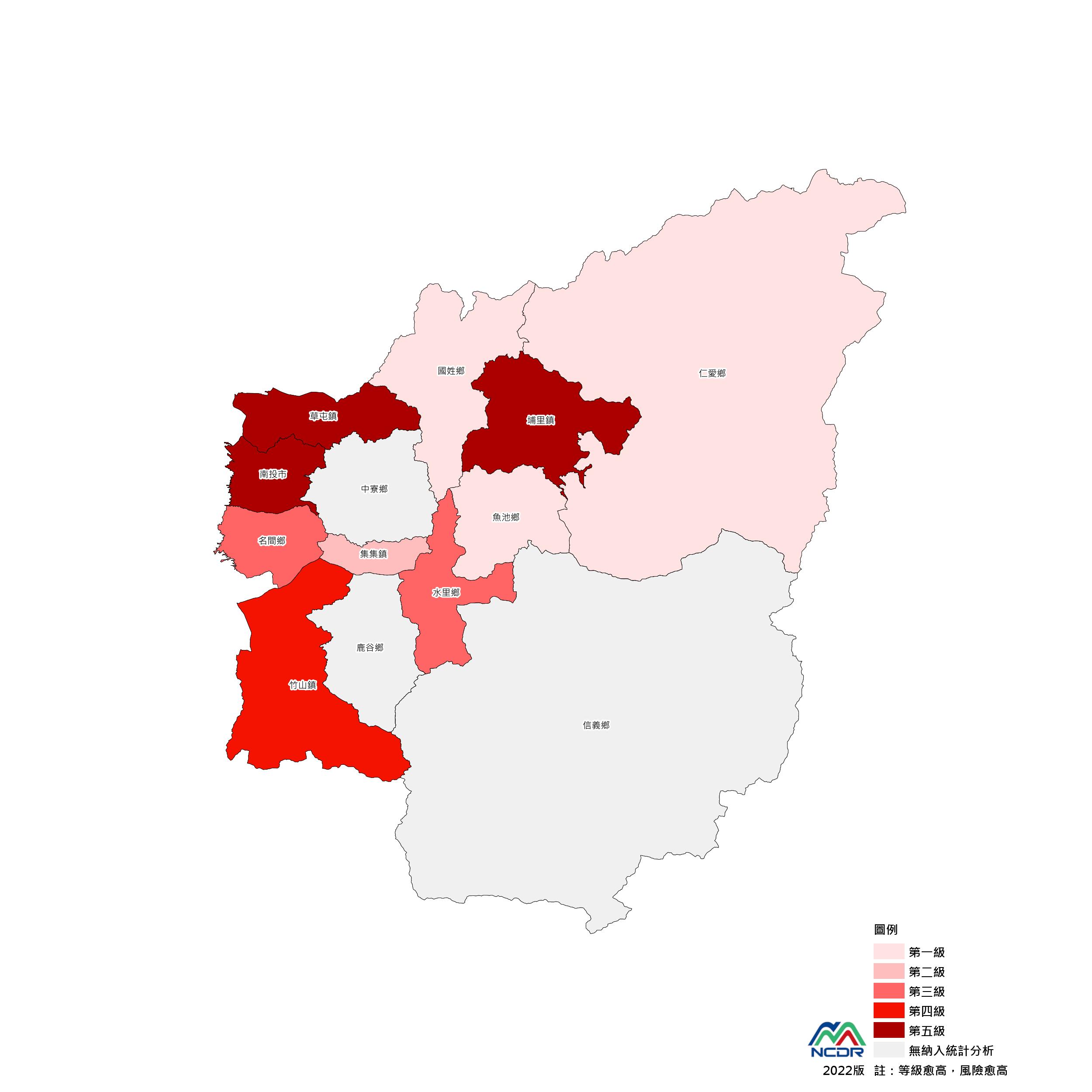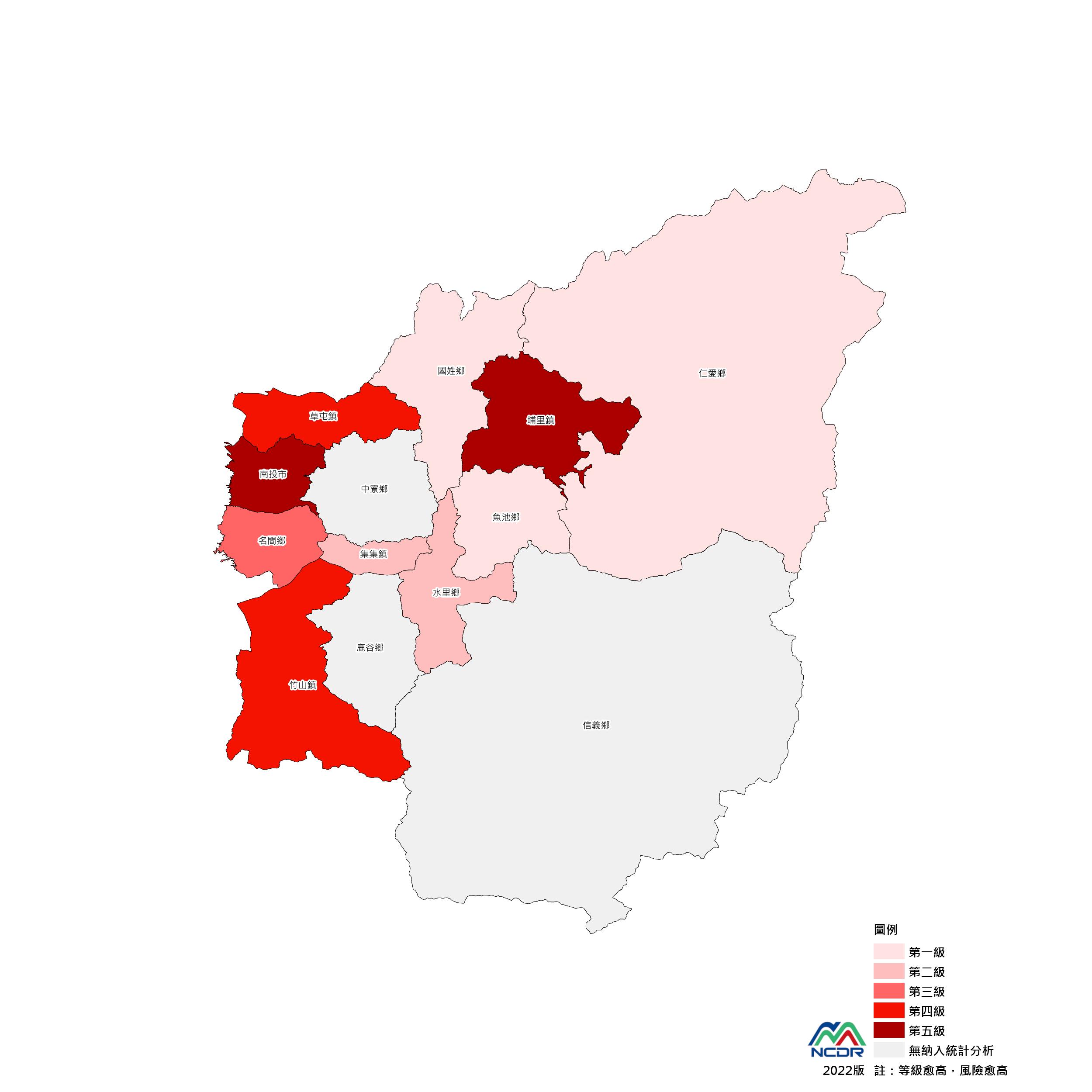 南投縣-鄉鎮市區淹水災害風險圖,是依據縣市內有淹水潛勢範圍之鄉鎮,相互比較其風險等級。