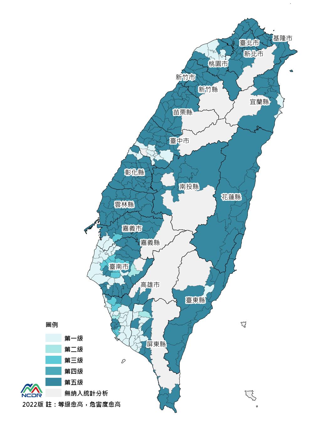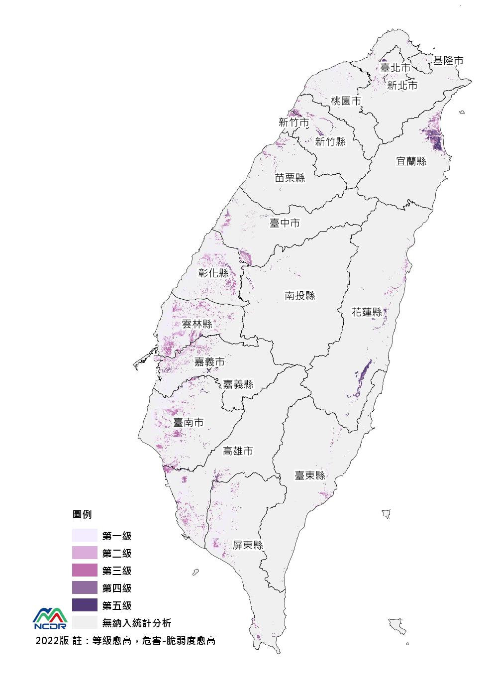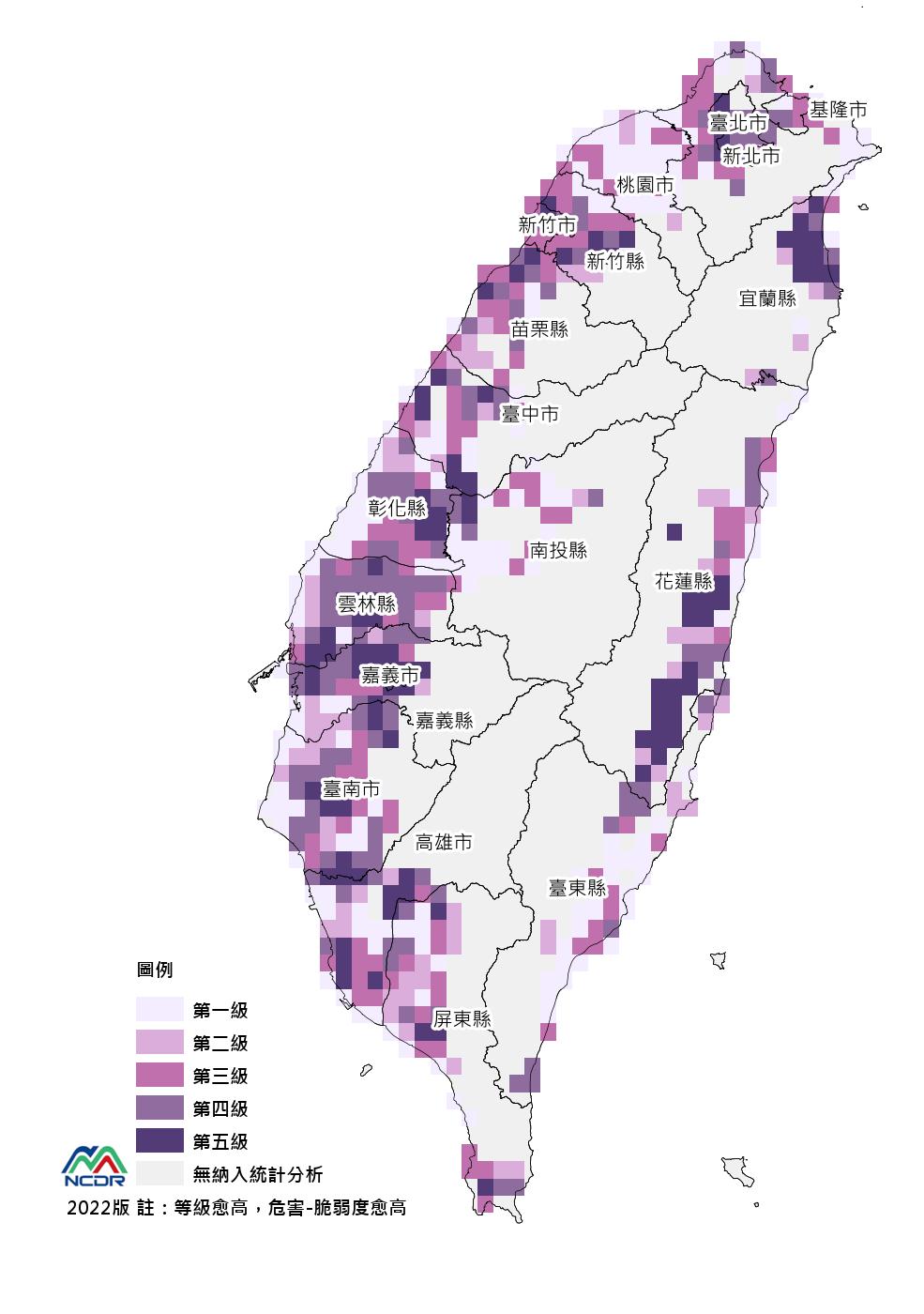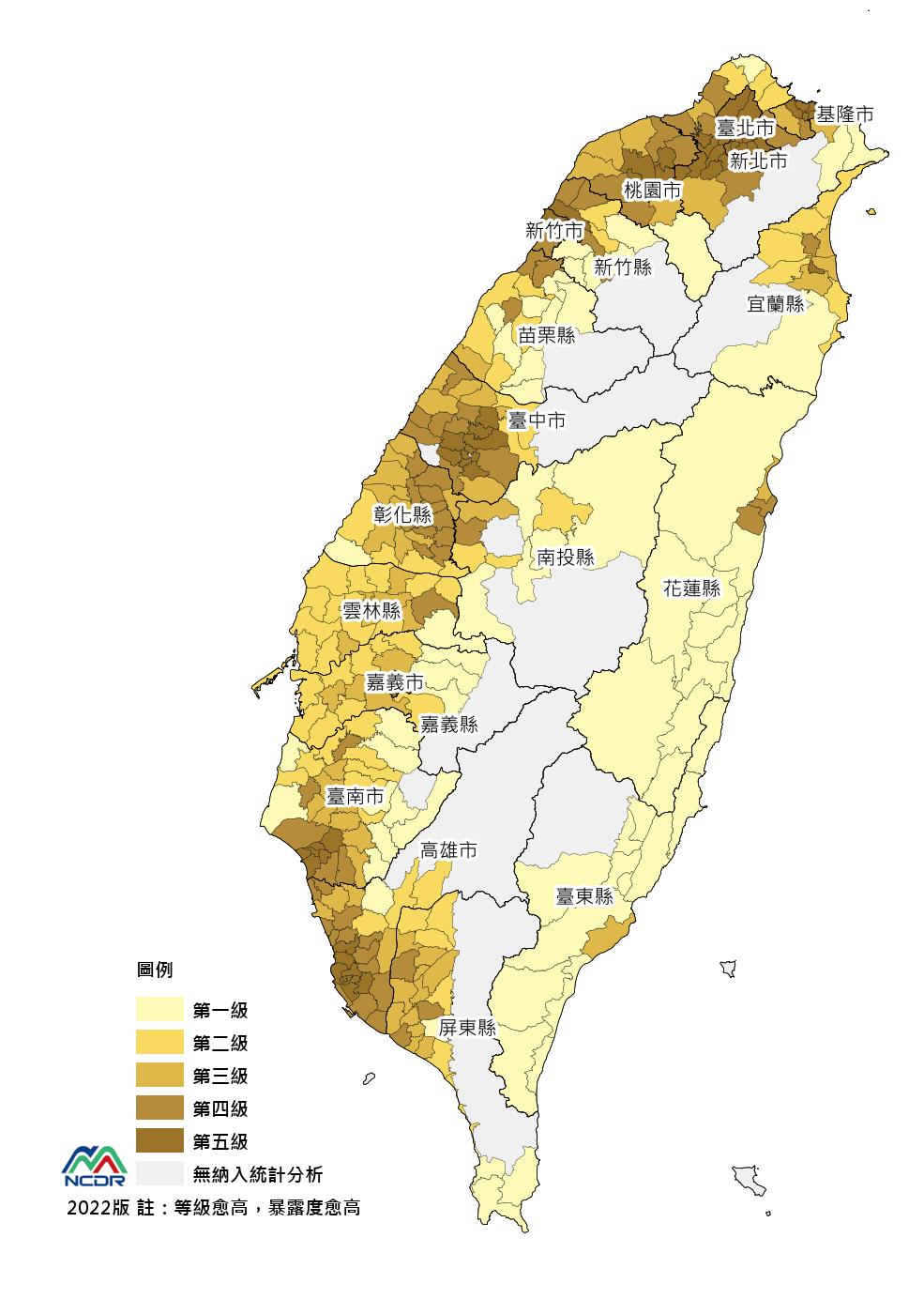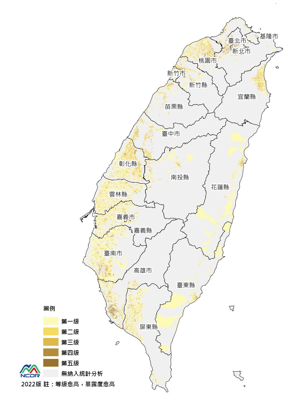 淹水暴露度等級五,表示人口密度相對較高,淹水暴露度等級一則表示人口密度相對較低。