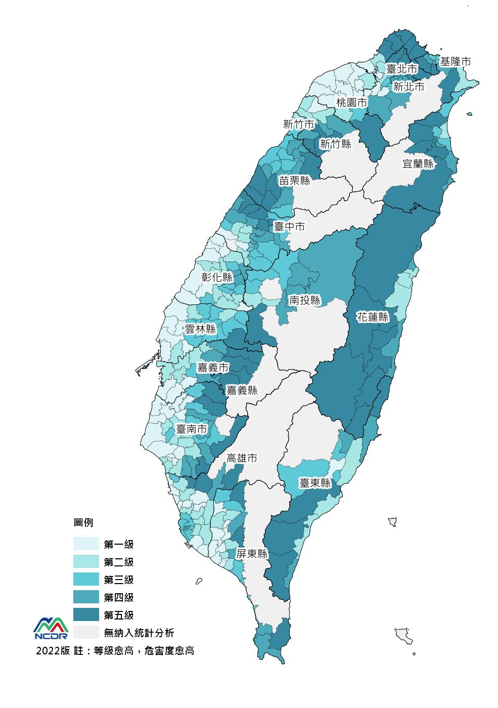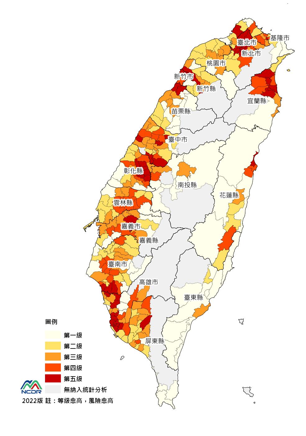 全臺-鄉鎮市區淹水災害風險圖,是依據縣市內有淹水潛勢範圍之鄉鎮,相互比較其風險等級。