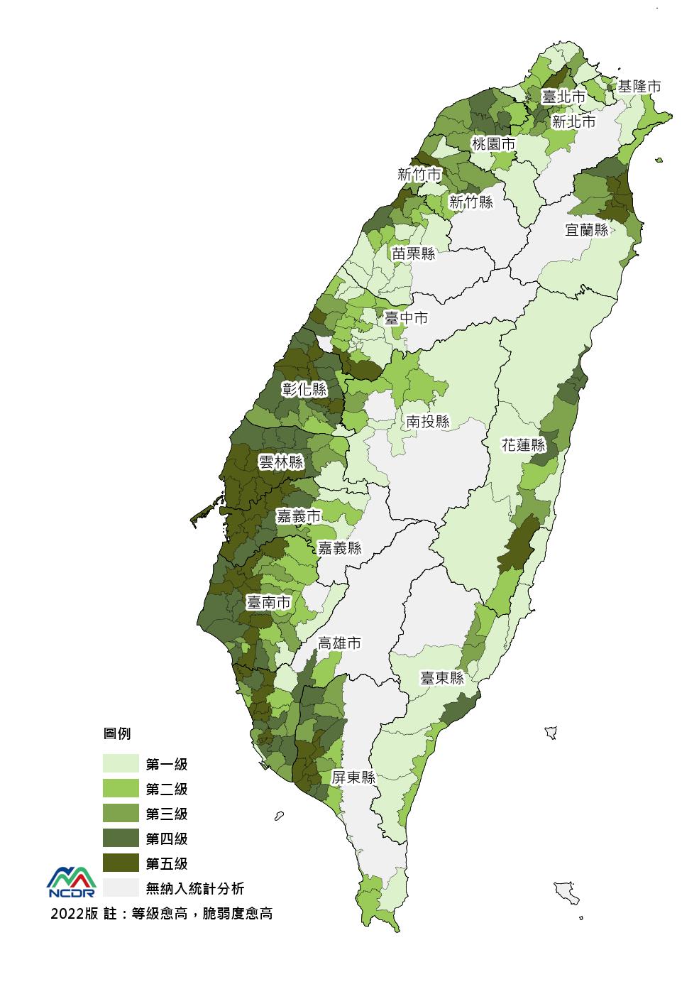 根據經濟部水利署公告的第三代淹水潛勢圖,以24小時定量降雨650公釐情境下之淹水潛勢圖為門檻值,評估區域內淹水深度與面積,計算各全臺-鄉鎮市區之淹水評分值,進而換算成淹水脆弱度等級,繪製成淹水脆弱圖。