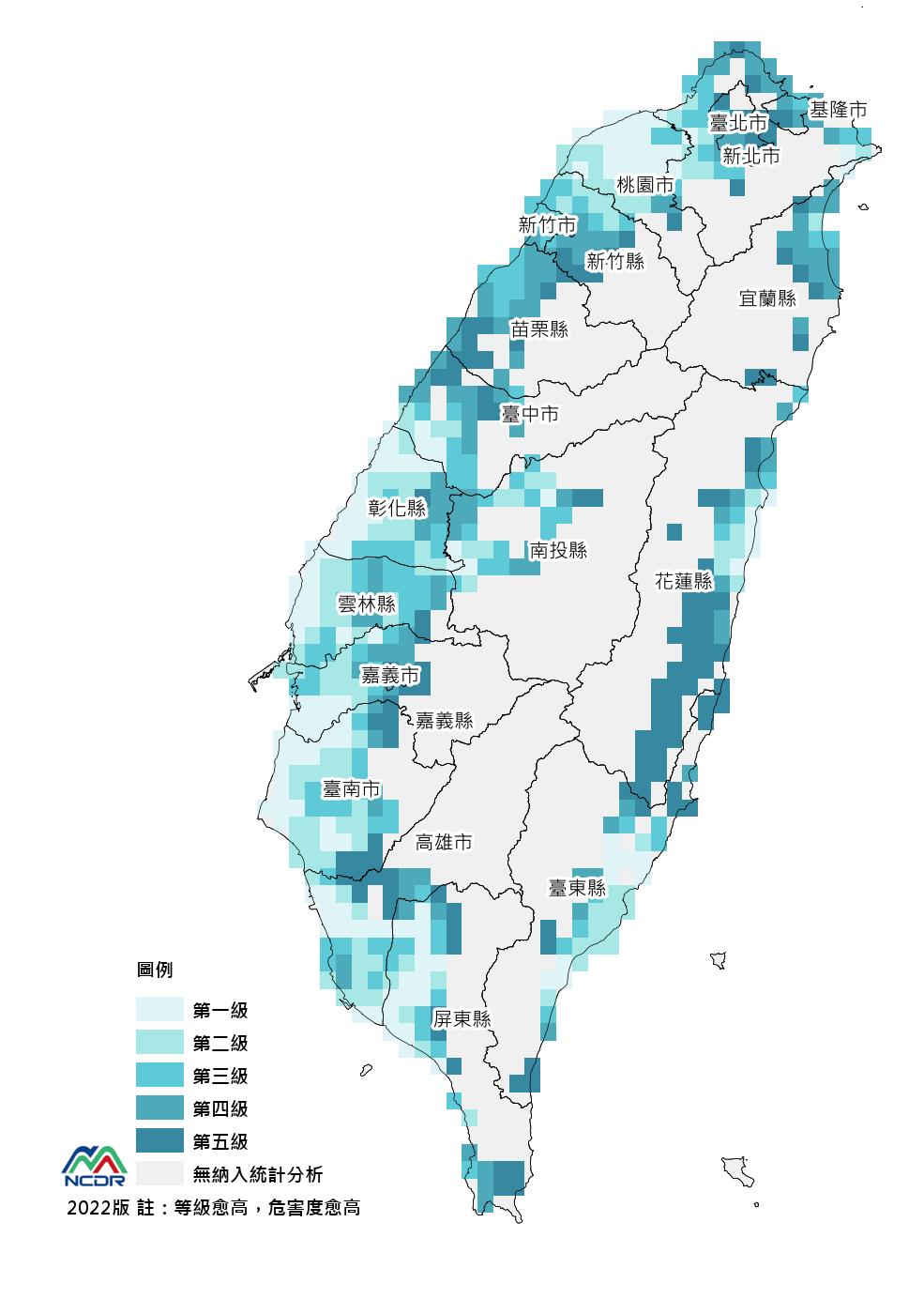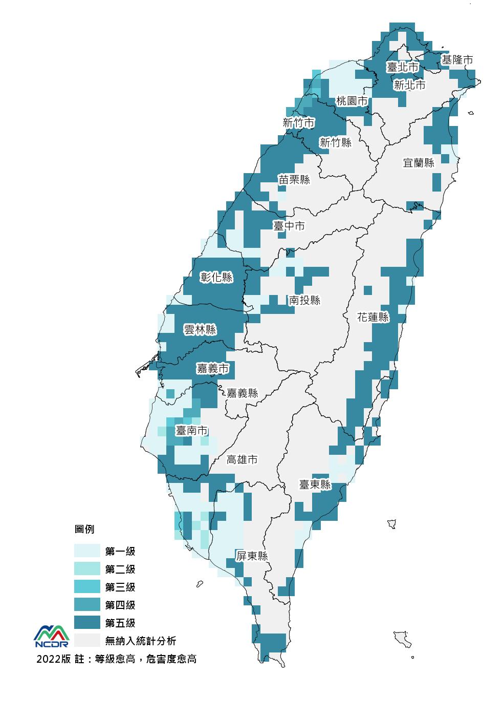 全臺-網格5km淹水災害風險圖,是依據縣市內有淹水潛勢範圍之鄉鎮,相互比較其風險等級。