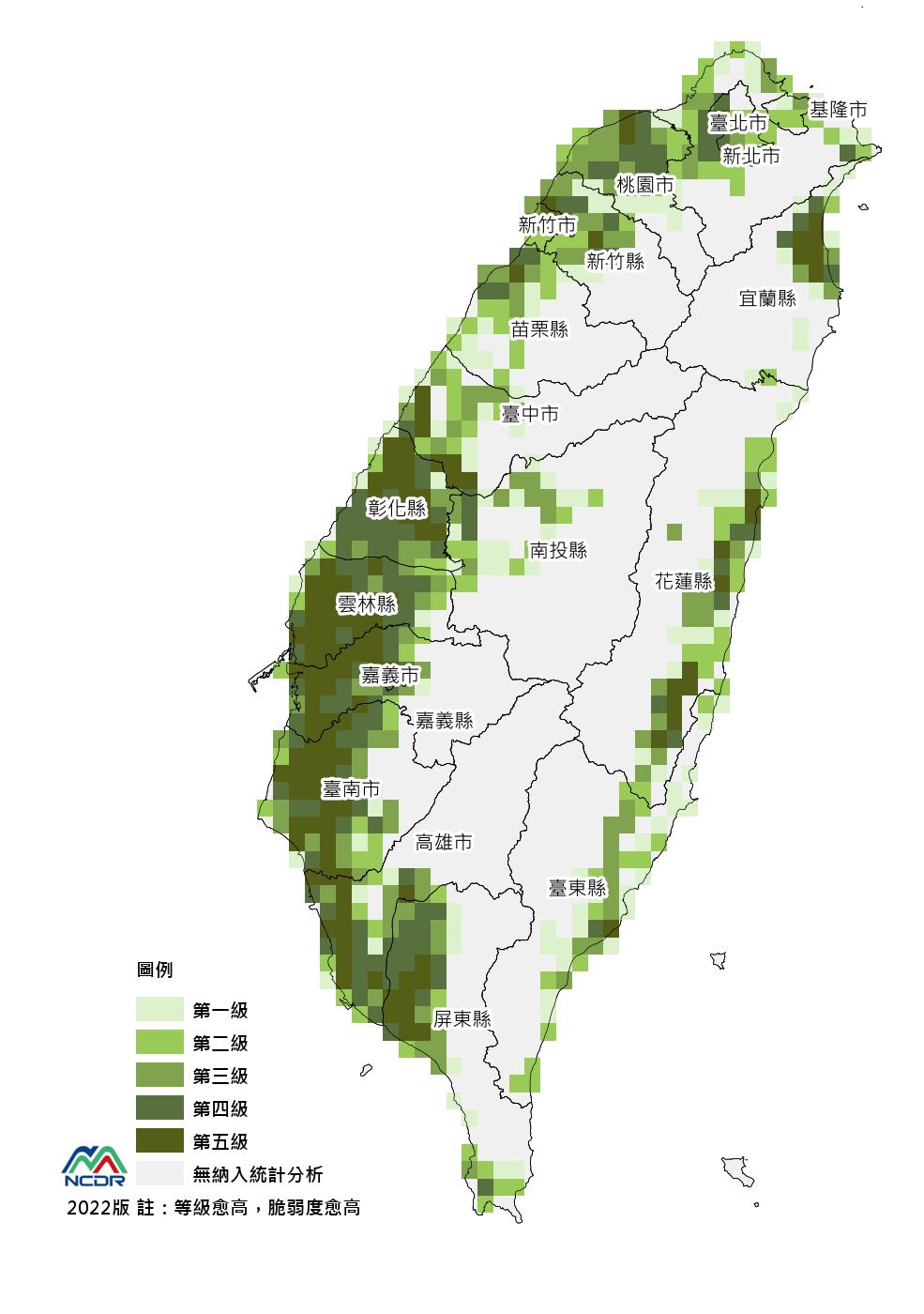 圖資呈現是以全臺有分析淹水潛勢圖之網格,進行相互等級比較,淹水脆弱度等級五,表示該網格發生的淹水深度或面積相對較大,淹水脆弱度等級一,表示該網格發生的淹水深度或面積相對較小。