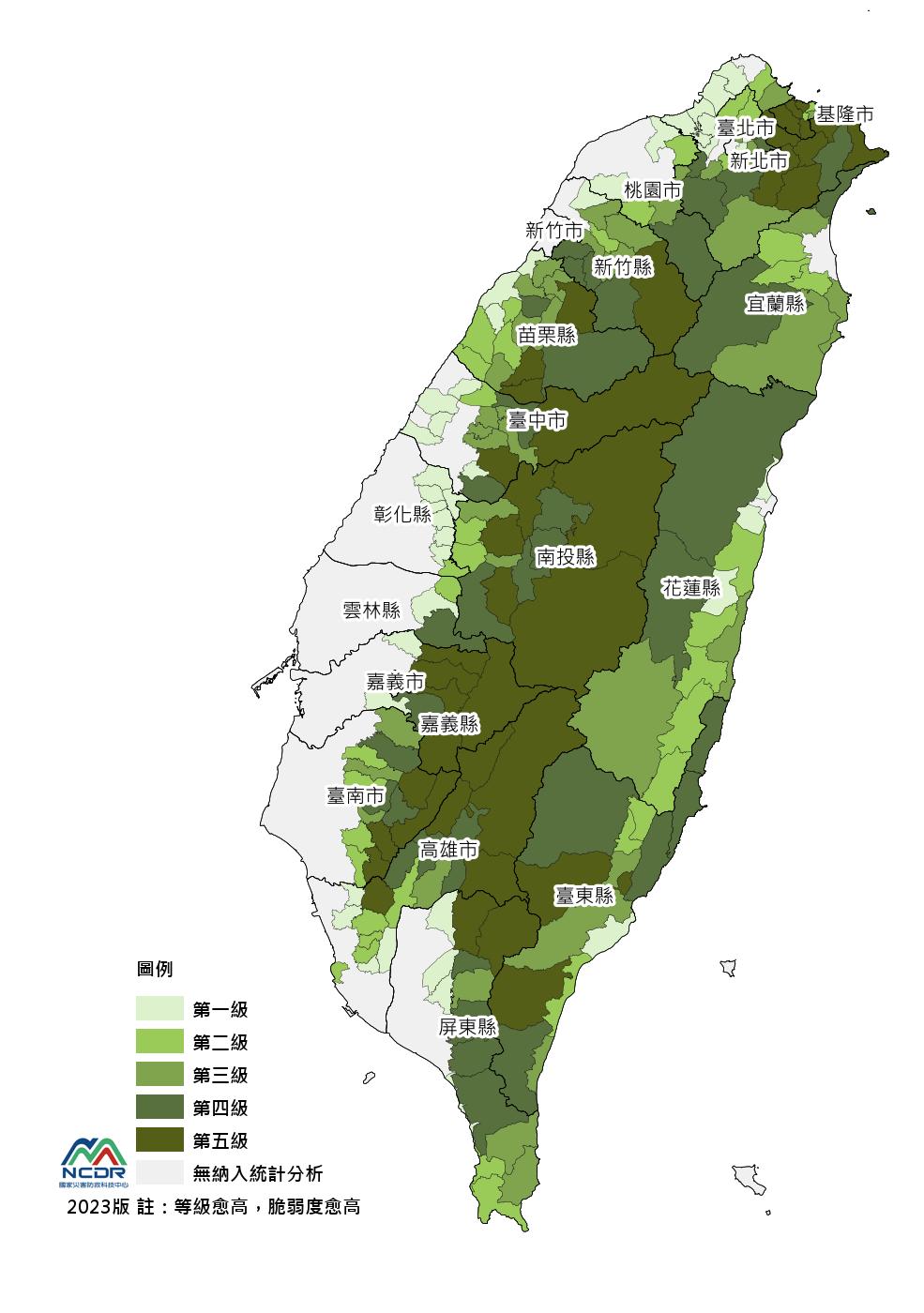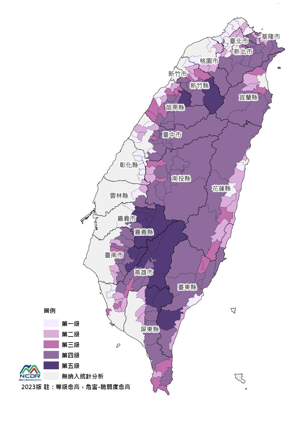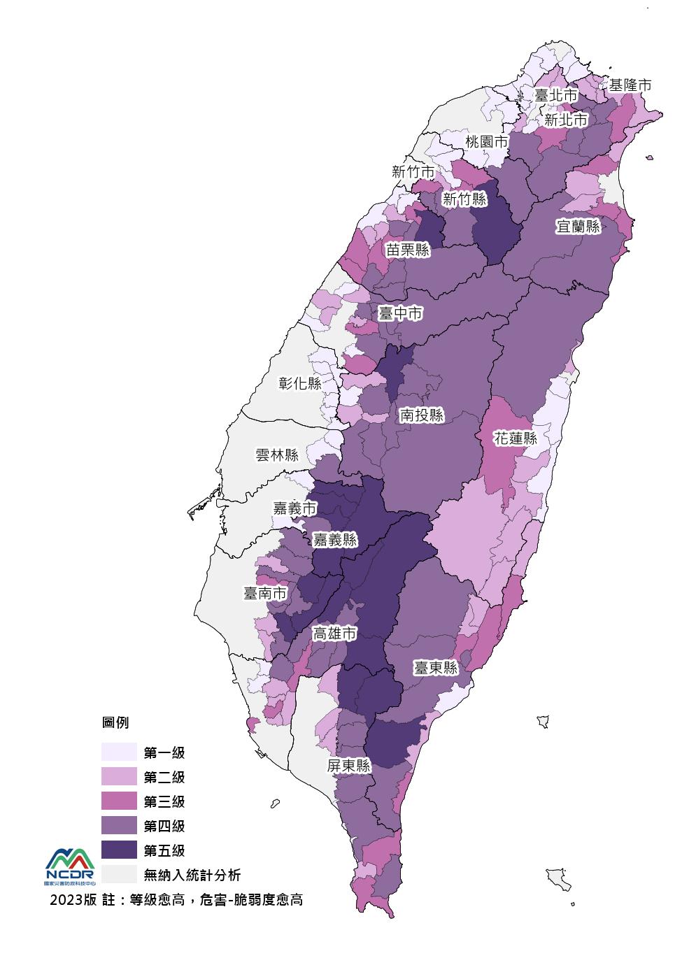 • 縣市版風險圖:風險等級的分級色階與全台不同,依據不同指標呈現該色階風險等級的空間分布。縣市層級應用與評估,建議以最小人口統計區較易呈現空間細緻度的風險變化。