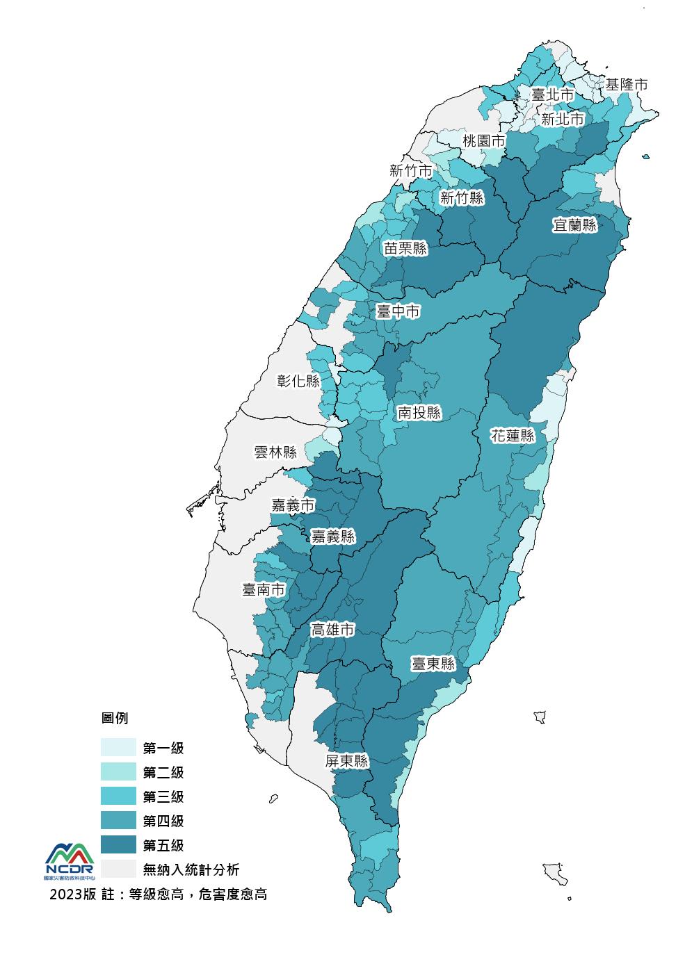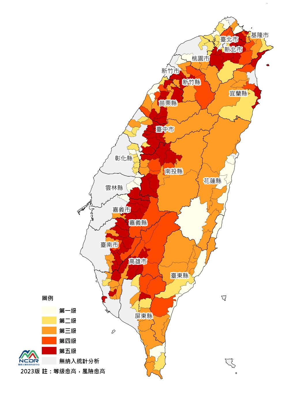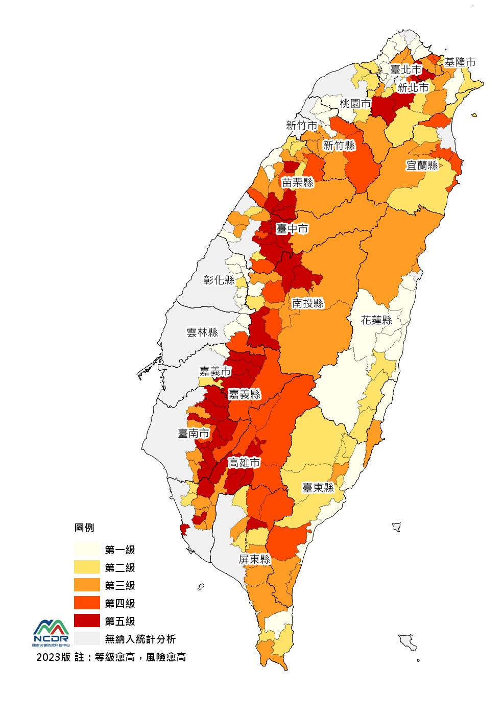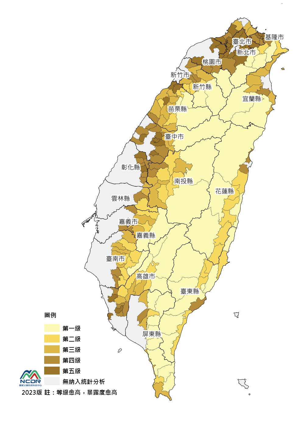 • 全台版風險圖:三種空間尺度中,建議以鄉鎮市區與5km網格尺度查詢其空間分布,較易辨識差異與應用。較適合應用於較上位的國家規劃評估參考。