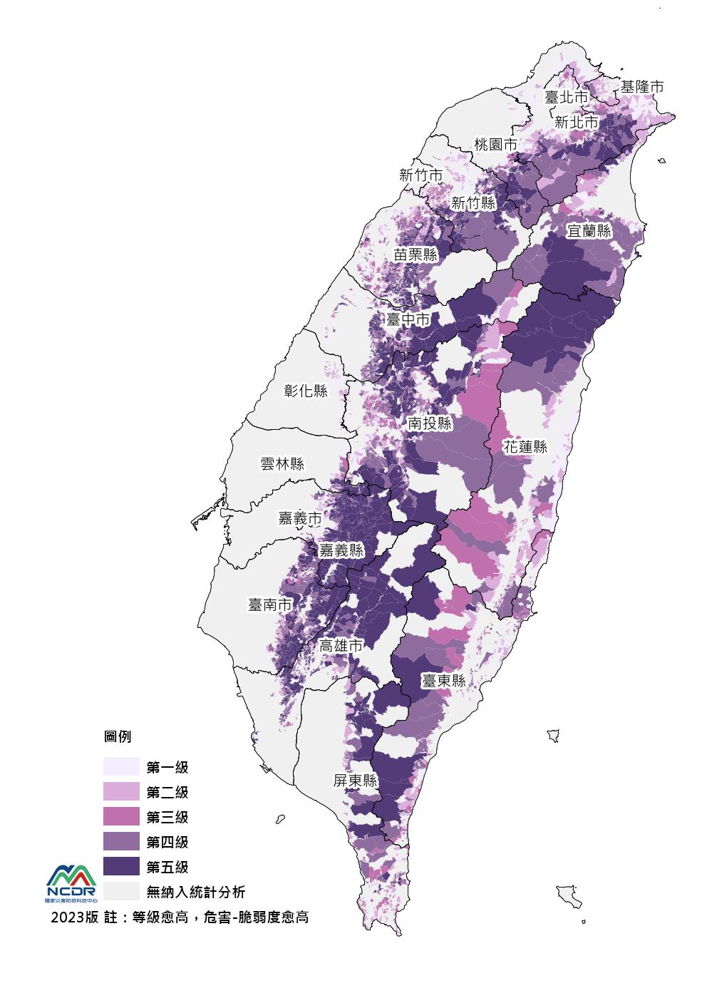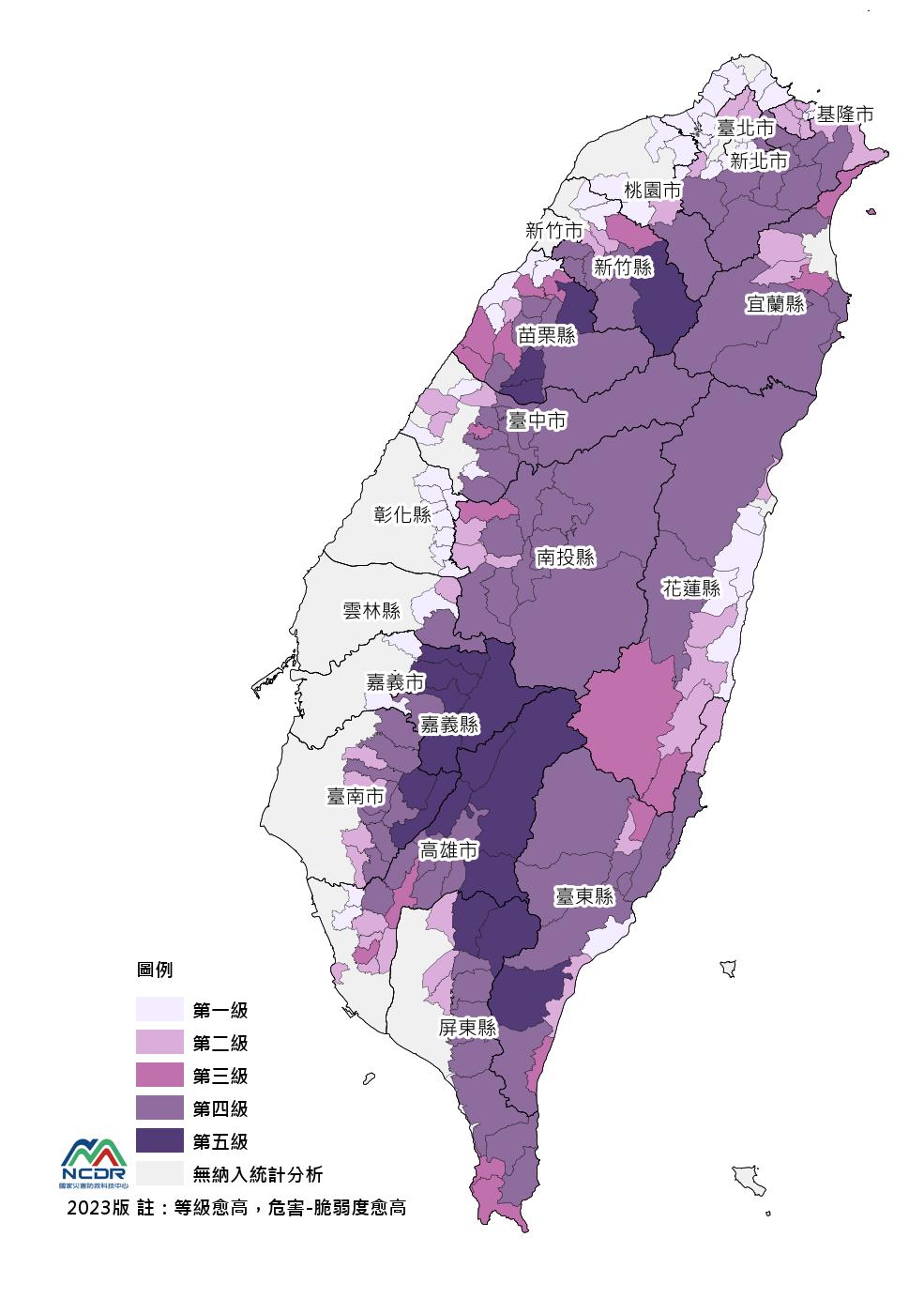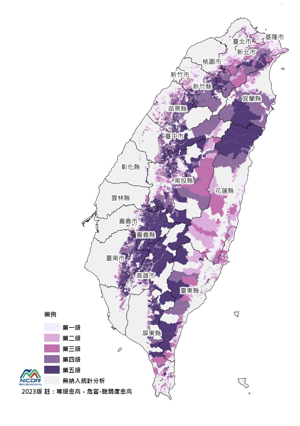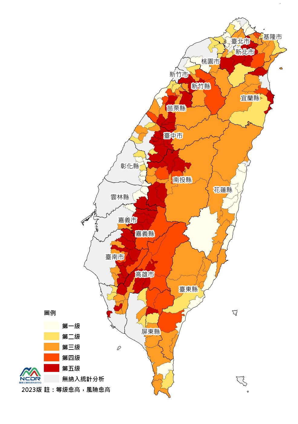 風險圖分別由氣候變遷坡地災害風險圖以行政區為空間單元分析,易辨識高風險的區位,行政區也較易推動應用。但其缺點為大部分鄉鎮市區範圍較廣大,會有行政區均質化的影響。