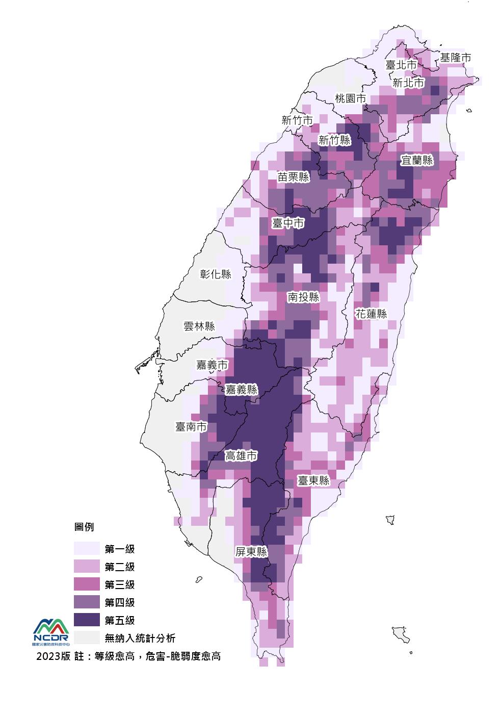 坡地危害度等級五,表示極端降雨發生機率相對較高,坡地危害度等級一則表示極端降雨發生機率相對較低。