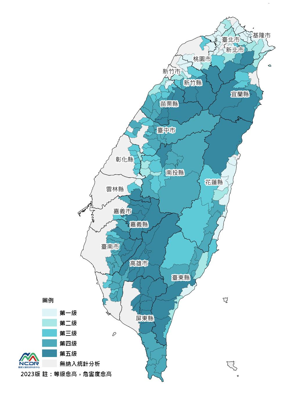 全臺-鄉鎮市區坡地災害風險圖,是依據全臺坡地警戒的鄉鎮市區,相互比較其風險等級。