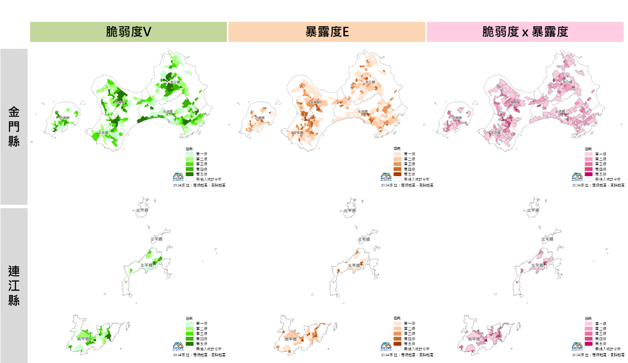 根據淹水潛勢圖與人口分布數據,可繪製出金門縣與連江縣的淹水脆弱度圖與高風險區空間分布圖,如圖2所示,以下將詳細說明脆弱度與暴露度的評估方式及其應用。