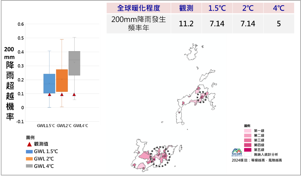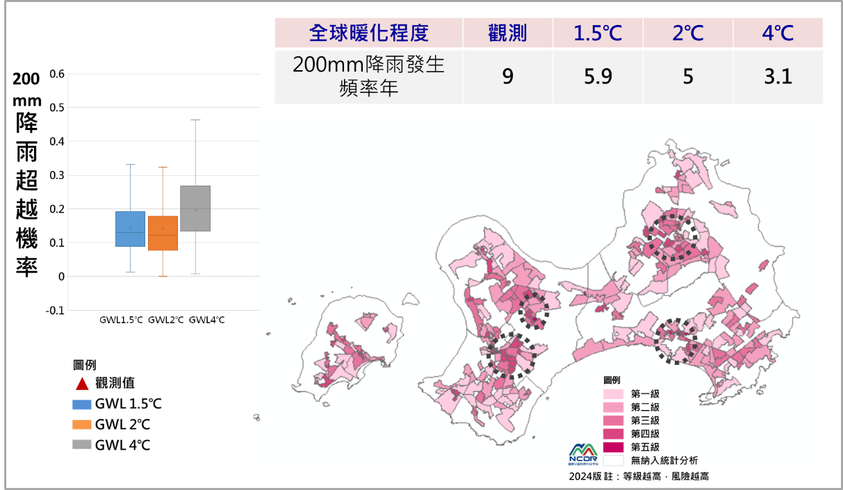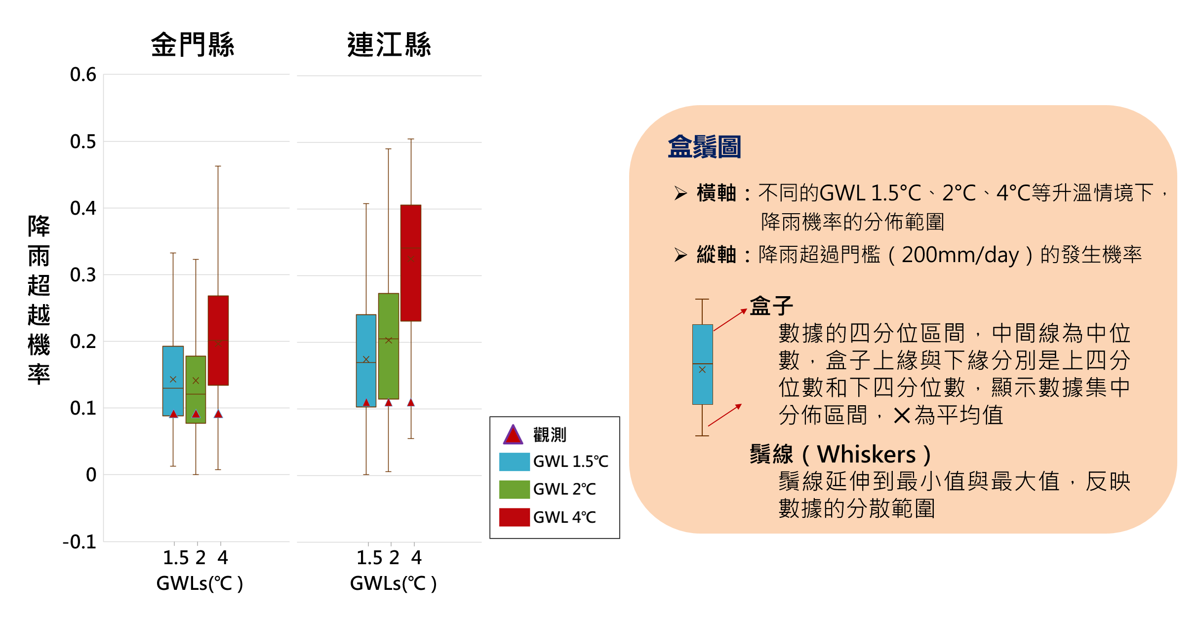 根據TCCIP提供之AR6報告中不同升溫情境(Global Warming Level, GWL)下的降雨統計降尺度資料,評估GWL 1.5℃、2℃與4℃情境下金門縣與連江縣的特定門口值下降雨機率。當降雨門檻超過200毫米/天(mm/day)時,各升溫情境下的降雨機率變化與發生頻率年如下: