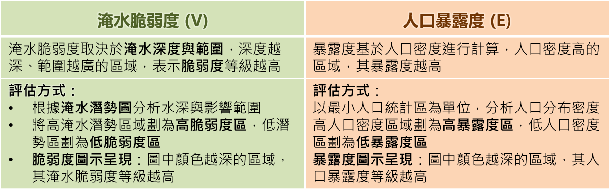 - 脆弱度(V)X暴露度(E)圖示呈現:顏色最深的區域表示人口密集且易淹水為高風險區,顏色淺的區域則表示風險相對較低