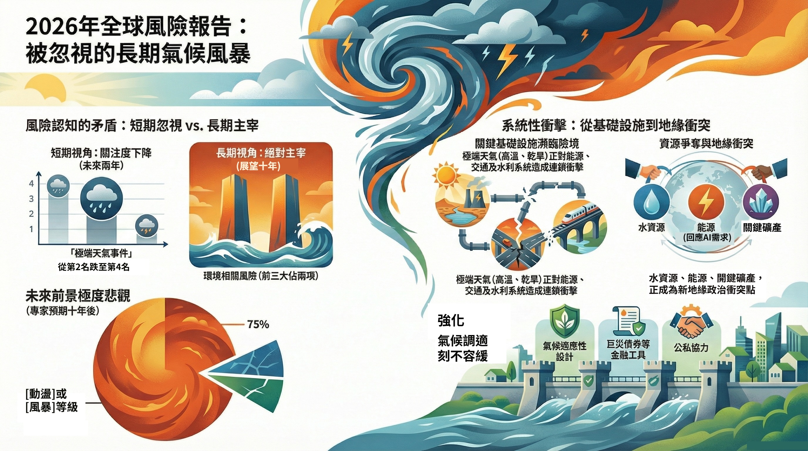 世界經濟論壇(WEF)最新發布的《2026 年全球風險報告》揭示的「環境警訊」,說明氣候變遷將是未來十年最確定的生存威脅